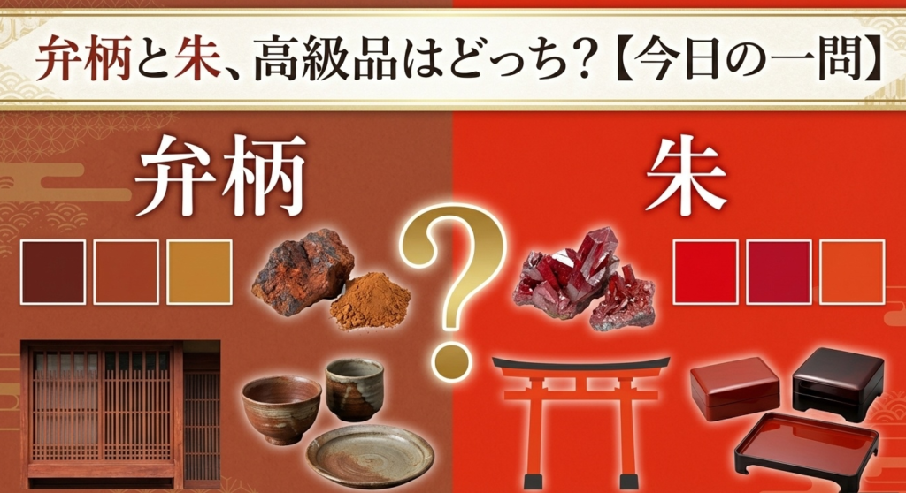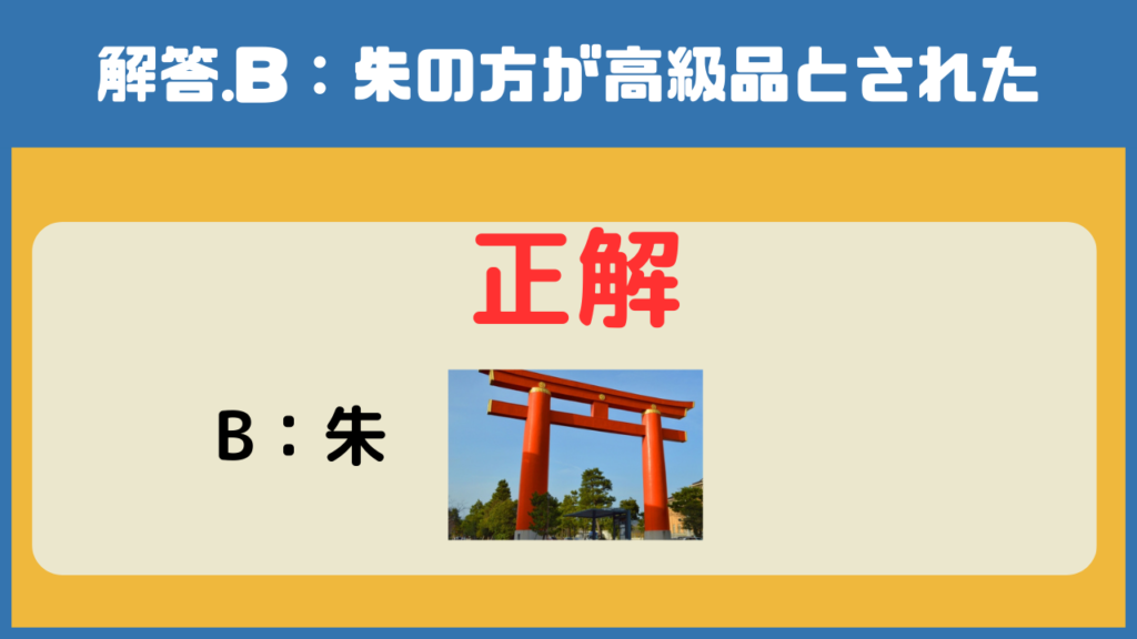 本日の問題は弁柄(べんがら) と 朱(しゅ)、日本の伝統建築において高級品とされ神社仏閣の重要な装飾に使われたのはどちらでしょうか?